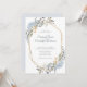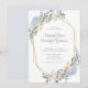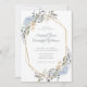 Invitaciones de boda con flores y hojas azules polvorientos en acuarela romántica en marco geométrico dorado. Agregue los detalles de su boda a esta invitación moderna de corona botánica. Este diseño elegante es ideal para bodas de primavera y verano.