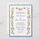 Elegante invitación a bodas temática Amalfitana con frutas pintadas a mano y flores comunes en los jardines mediterráneos con borde azul. Ideal para una boda italiana de destino