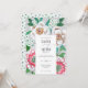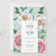 Invitación de boda pintada a mano con hojas verdes y flores blancas y rosadas sobre fondo gris y pequeños colores de acento fucsia.