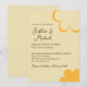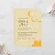 Esta invitación de boda presenta un tema retro naranja y amarillo inspirado en los años 70. El fondo es de un color amarillo suave, con texto marrón y los nombres de la pareja impresos en una elegante fuente de escritura. Una flor de estilo años 70 naranja está impresa en la parte inferior derecha, con un contorno de flor coincidente en la parte superior.
