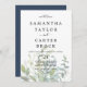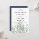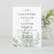 Este verano, la verde y descolorida invitación a una boda folclórica, es perfecta para un elegante boda de verano. El diseño botánico presenta una disposición exuberante de eucaliptos de acuarela pintada, vegetación y hojas verdes con sutiles brotes de flores rosas de color rosa ondulado con tu texto.