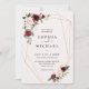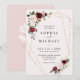 Flores elegantes y rústicas de color rosa pálido y vino borgoña y forma geométrica dorada enmarcan la invitación de boda. La parte trasera de la invitación es un rubor rosa sobre rosa sólido. Sus invitados amarán este diseño único. Artículos coincidentes en esta colección.