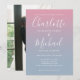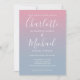 Con nombres de estilo de firma, esta elegante invitación de boda se puede personalizar con su información en letras blancas elegantes sobre un fondo de ombre rosa y azul polvoriento con la foto elegida en el reverso. Puede personalizar el color de fondo para que coincida con el tema de su boda. Diseñado por Thisisnotme©
