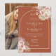 Flores elegantes de pampas de acuarela y un arco chic, enmarcan los detalles de su celebración de boda especial y las iniciales del monograma se establecen en tipografía elegante sobre un fondo de terracota con su foto especial en el reverso. Diseñado por Thisisnotme©
