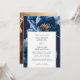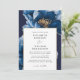 Esta elegante invitación a una boda floral dorada y azul marino puede ser personalizada con su información en tipografía moderna y una foto especial al revés. Diseñado por Thisisnotme©