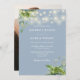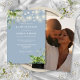 Este elegante eucalipto verde luces de cuerda botánicas polvorientas invitación a la boda azul se puede personalizar con tu información en tipografía de moda con tu foto especial al revés. Diseñado por Thisisnotme©