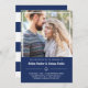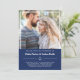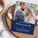 Invitación a una boda con fotos para un boda con temática náutica con tu foto enmarcada por un borde de cuerda blanca. Agregue sus nombres en un guión moderno en negrita encima de un separador de anclas contra un fondo azul marino.