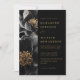 Esta elegante invitación a una boda floral en negro y dorado puede ser personalizada con su información en tipografía moderna. Diseñado por Thisisnotme©