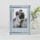 Boda fotográfica Salva la fecha. Fondo azul helado. Filtro blanco y negro aplicado a la foto. Plata metalizada.