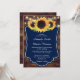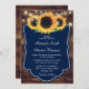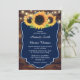 Estas rústicas invitaciones a bodas de color azul marino con girasoles y luces de cuerdas sobre un fondo de madera de granero son la elección perfecta para un país rústico de color azul marino o para una fiesta de bodas de granero inspirada en flores de girasol. Diseño de personalizable completo. Personalice fácilmente esta tarjeta boda de girasol con los detalles de su boda.