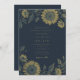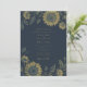 Esta invitación a la boda azul marino presenta un borde muy detallado de girasoles grabados, enmarcando los detalles de tu boda en un texto elegante de color dorado. El diseño botánico simétrico combina la calidez rústica con la elegancia formal, ideal para bodas en el jardín o a finales de primavera. En la parte posterior se incluye un monograma de girasol personalizado con las iniciales de la pareja para un toque de acabado refinado. Atención: el oro es un color impreso, no metálico o Relieve metalizado.