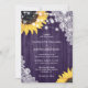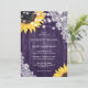 Esta elegante invitación a una boda floral con girasoles en un fondo de madera granero adornado con luces de cuerda y encaje floral blanco es perfecta para invitar a sus invitados a su rústica fiesta de bodas púrpura inspirada en los girasoles. Personalice fácilmente esta plantilla con los detalles de su boda.