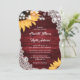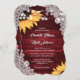 Esta rústica invitación a celebrar bodas rojas con girasoles y encaje rústico sobre un fondo de madera de granero es perfecta para invitar a sus invitados a su rústica fiesta de bodas rojas inspirada en flores de girasol.