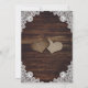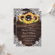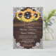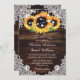 Invitaciones caseras de girasol rústicas personalizados, ideales para una fiesta rústica de campo, patio trasero o bodas de granero inspiradas en flores de girasol. Los objetos de juego completan estas invitaciones florales rústicas a bodas con girasoles sobre un fondo rústico de madera adornado con encajes florales blancos y luces de cuerdas.