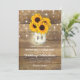 Invitaciones de boda country chic con fondo de madera rústica, luces de cadena, un tarro de mason que contiene girasoles y luciérnagas brillantes, y una plantilla de boda elegante y fácil de personalizar.