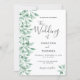 Una invitación botánica de bodas de moda en blanco y verde. Un fondo blanco de moda en la parte delantera. Decorada con vegetación, follaje y patatas. Guión moderno de gran tamaño con letra, tipografía con el texto: El boda de. Plantillas para sus nombres y detalles del boda. Texto gris oscuro. Fondo: fondo verde claro.