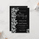 Una invitación de bodas de moda en blanco y negro y plata. Un fondo negro de moda en el frente. Decorado con estribos botánicos de color plateado y blanco y follaje. Guión moderno de gran tamaño con letra, tipografía con el texto: El boda de. Plantillas para nombres y detalles del boda. Texto blanco. Fondo negro.