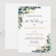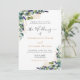 Un fondo blanco decorado con eucaliptos acuáticos, flores de lavanda y follaje dorado. Personalice y agregue sus nombres y detalles del boda. Letras de color negro y dorado.