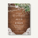 Sumérjase en un mundo de encanto rústico con nuestra bella invitación a la boda. El diseño, de madera rústica, presenta una delicada disposición de hojas de color acuático, iluminadas con luces de cuerda en la parte superior para dar un toque encantador. La parte inferior de la tarjeta está decorada con un exquisito ilustracion de encaje blanco, lo que realza su atractivo vintage. En el interior, la armoniosa combinación de escritura moderna y tipografía serif clásica despliega elegantemente tus detalles bodas, creando una invitación tan memorable como tu día especial.