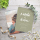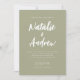 Una simple y casual, moderna y elegante invitación a la boda con una foto de la pareja en la parte trasera y una minimalista tipografía con letras de los detalles del boda en un fondo verde sabio.