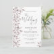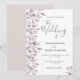 Una invitación de bodas a la moda en rosa polvoriento y blanco. Un fondo blanco de moda en la parte delantera. Decorada con polvorientos botánicos de color rosa y follaje. Guión moderno de gran tamaño con letra, tipografía con el texto: El boda de. Plantillas para nombres y detalles del boda. Texto gris. Parte posterior: fondo rosa polvoriento claro.