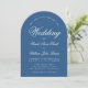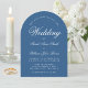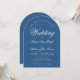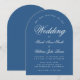 Una simple y minimalista invitación a la boda. Sólo tiene texto blanco sobre un fondo azul clásico. La palabra Boda y los nombres están escritos en un guión caligráfico elegante. Encima de la palabra Boda hay un texto en arco.