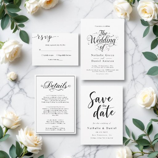 Esta elegante invitación a la boda en blanco y negro es perfecta para un boda moderno. El diseño es sencillo y cuenta con una elegante caligrafía negra sobre un fondo blanco y limpio. La tarjeta de invitación incluye los detalles del boda en la parte posterior en lugar de pagar por una tarjeta separada.