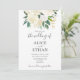 Invitación nupcial moderna con flores de color blanco y neutro con acentos follantes (falsos) de oro. Perfecto para bodas de primavera y jardín.