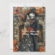 Boda de Halloween con una linda pareja de esqueletos vestidos con su mejor ropa. La novia lleva un vestido negro con imágenes de calaveras y tiene calabazas en el pelo. Groom lleva un traje negro y sombrero puntiagudo. Hay grandes arañas negras arrastrándose por ahí mientras un murciélago cuelga del manto. Invitación a la boda de gótico que puede ser personalizada para satisfacer sus necesidades.