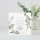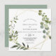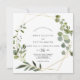 Esta invitación a la boda de hojas verdes tropicales es perfecta para un boda rústico. El diseño está decorado con hermosas hojas verdes pintadas a mano, adornando un marco geométrico dorado.