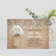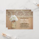 Curta invitación rústica de boda con frasco de albañil con flor de hidrangea blanca. Invitación perfecta para una boda de campo con encaje vintage y acentos de madera angustiada.