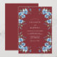 Los tonos profundos de borgoña proporcionan un telón de fondo sombrío para delicadas flores de aciano azul acuarela y exuberante follaje. El diseño presenta pétalos suaves que se asemejan a las flores de cerezo combinadas con pequeñas bayas azules para un aspecto invernal sofisticado. Esta paleta de colores llamativa crea una estética romántica y elegante adecuada para bodas formales de fin de año.