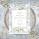 Con delicados copos de nieve cayendo sobre el follaje verde en un fondo de escarcha invernal. Los detalles de su boda están dentro de un borde geométrico dorado elegante. Diseñado por Thisisnotme©