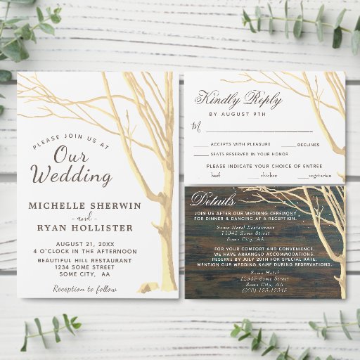 Invitación a la Boda de Invierno Rustica Sencilla de Árbol Cae. Invitación rústica a bodas de invierno con un árbol con ramas. El texto está en un moderno guión blanco - personaliza con tu información. Se puede personalizar que cambie más las fuentes y los colores de las letras. La invitación es apta para boda rústico en invierno o otoño.
