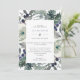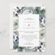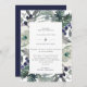 Una bella invitación a la boda de invierno, con un marco floral acuarela de color azul marino, blanco y verde con rosas, bayas y hojas.