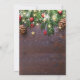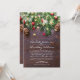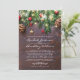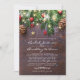 Invitaciones de boda de invierno rústicas con fondo de madera oscura, ramas de árbol de Navidad festivas, adornos de árbol rojos y dorados y luces de hadas.