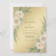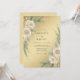 Un fondo dorado brillante proporciona una base lujosa para este diseño de temporada. Delicadas rosas de crema están dispuestas artísticamente con agujas de pino de color verde salvia invernal y ramas de cedro para crear una estética botánica sofisticada. Esta paleta metálica combina calidez con elementos florales suaves para una atmósfera formal y opulenta.