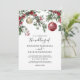 Invitaciones de boda de invierno rústicas con un fondo blanco simple, flores y follaje de acuarela festivas, adornos navideños rojos y dorados, y una plantilla de boda elegante que es fácil de personalizar.