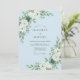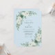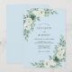 Este diseño presenta un fondo azul cielo calmante decorado con arreglos botánicos elegantes. Rosas blancas exuberantes se emparejan con eucalipto verde polvoriento y acentos de suculentas texturizadas para una estética orgánica serena. La paleta de tonos fríos crea una atmósfera sofisticada adecuada para un evento estacional de invierno o primavera.