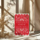 El diseño de la invitación a la boda del Boda de Arte Folclórico Rojo Papel Picado mexicano presenta un fondo rojo vibrante con delicados patrones de corte blanco que recuerdan a un papel tradicional. La composición simétrica incluye grandes flores florecientes, ramas frondosas, motivos cardíacos y semicírculos tipo ventilador, que evocan un ambiente festivo y romántico. La parte superior e inferior están bordeadas de bordes de vieiras y ventiladores florales, mientras que la parte central queda clara para el texto en personalizable, bordeada por líneas punteadas tipo estrella para añadir elegancia.
