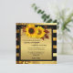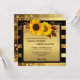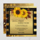 Una elegante invitación a la boda con dos girasoles en hojas de otoño con rosas de oro y dorados giratorios florales sobre un brillante purpurina de oro y fondo rayado negro.