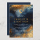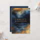 Esta invitación a la boda nocturna celestial en el cielo es una versión abstracta moderna de la temática celestial del boda. El beige ocre oscuro para la forma lunar y los nombres de la pareja en un azul oscuro y el fondo abstracto de temática dorada hacen que esta invitación a la boda destaque.
