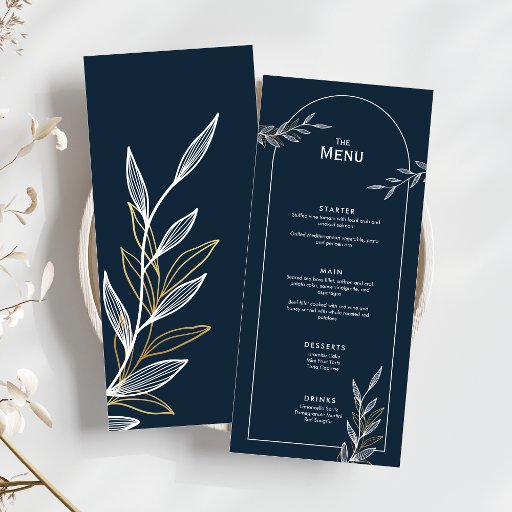 Si eres una novia moderna que busca una invitación elegante e intemporal, este diseño es perfecto para ti. Con una bonita combinación de azul marino y una cuidada hoja de oro, ofrece un estilo contemporáneo que se complementa con cualquier paleta de colores.