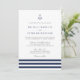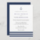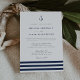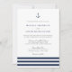 Nuestras elegantes invitaciones nupciales presentan un estilo náutico clásico con un aspecto limpio y minimalista. El diseño presenta tres rayas de azul marino rico con un ilustracion de ancla en la parte superior. El elegante bloque y la escritura con letras en gris suave y azul marino coincidente completan el aspecto. Perfecto para el club náutico, el barco, la playa o los bodas de verano.