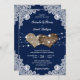 Estas románticas invitaciones a bodas rústicas con corazones burlap contra una burlap y antecedentes de encaje adornados con luces de cuerdas son perfectas para invitar a sus invitados a su fiesta de bodas rústica de color azul marino/granero.