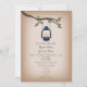 Invitación nupcial con un ilustracion de una linterna de camping azul colgando de una rama arbórea con hojas verdes. El fondo está inspirado en el stock de tarjetas. Personaliza el texto con detalles de tu ocasión.