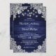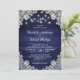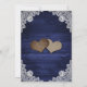 Nuestras rústicas invitaciones de boda azul marino con luces de cuerda y encaje floral blanco sobre un fondo de madera de granero son perfectas para invitar a sus invitados a su rústico campo azul marino, patio trasero o fiesta de bodas de granero.