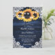 Elegantes invitaciones de boda azul marino y girasol, ideales para una romántica fiesta de boda rústica de color azul marino inspirada en flores de girasol. Elementos coincidentes disponibles.
