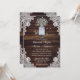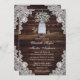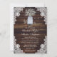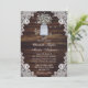Agradable invitación rústica para bodas de bebé al aire libre con flores de aliento de bebé dentro de un frasco de albañil contra un fondo rústico de madera adornado con encaje floral blanco y luces de cuerda. Esta rústica invitación a la boda floral es perfecta para su rústico país, o fiesta de bodas en granero inspirada en la respiración del bebé. No se usará ningún encaje real en la preparación de estas invitaciones de bodas del aliento del bebé.
