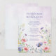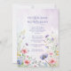 Hermosa lavanda, fondo de color azul y rosa con suaves flores silvestres pastel rodeando hermosas fuentes se usaron para crear esta encantadora invitación a la boda. Perfecto para cualquier boda de temporada.